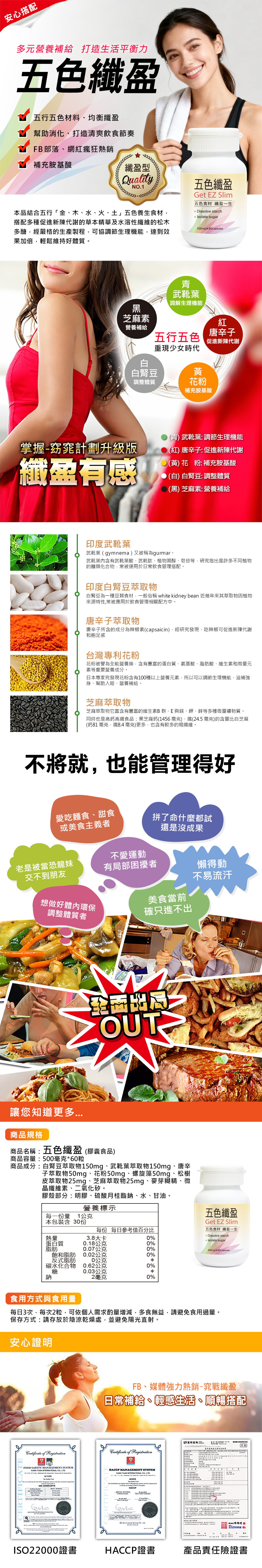 白腎豆萃取物150mg、武靴葉萃取物150mg、唐辛子萃取物50mg、花粉50mg、螺旋藻50mg、松樹皮萃取物25mg、芝麻萃取物25mg、麥芽糊精、微晶纖維素、二氧化矽。 (膠殼部份:明膠、硫酸月桂脂納、水、甘油)